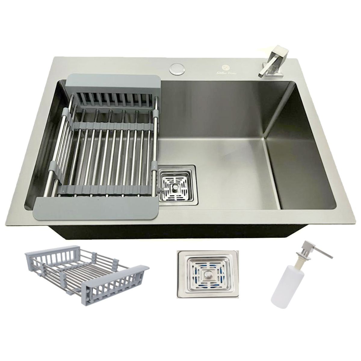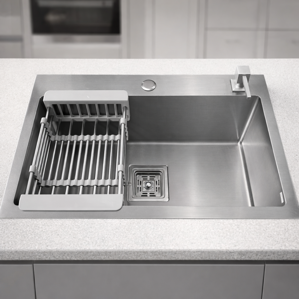 Acompanha válvula de 4 1/2″ que possibilita a instalação de Triturador de Resíduos, Escorredor de Louça em Aço Inox e Dispenser de detergente em Aço Inox.